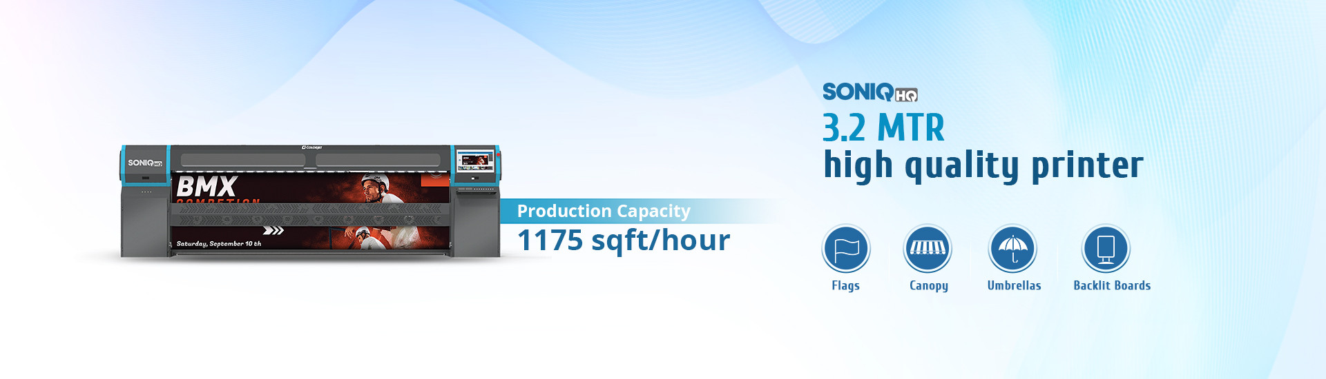 SoniQ HQ is a brand new 10 feet Indoor & Outdoor High Quality Eco Solvent Printer. This machine combines digital advantages of high-quality print using ColorJet recommended Eco-Solvent inks.The configuration supports 4 Color CMYK options with speeds upto 1175 sqft/hr. Sonic HQ is most suitable for a large range of Eco solvent applications like Canvas, SAV, PVC Banner, Backlit Film, Window Film, Fabric - both Eco Solvent & Solvent Base. SoniQ HQ is designed to deliver exceptional Quality at optimal ownership cost for all type of indoor and outdoor commercial printing applications.