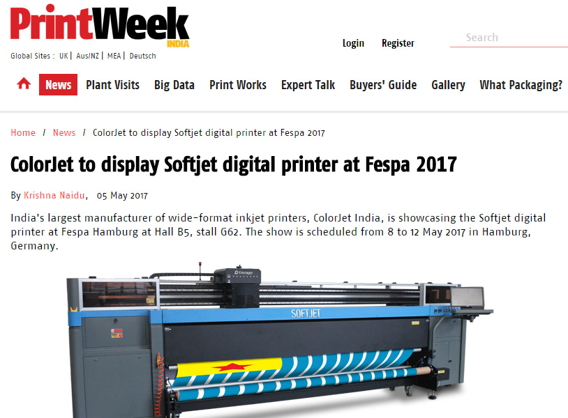 India's largest manufacturer of wide-format inkjet printers, ColorJet India, is showcasing the Softjet digital printer at Fespa Hamburg at H...