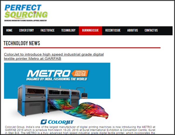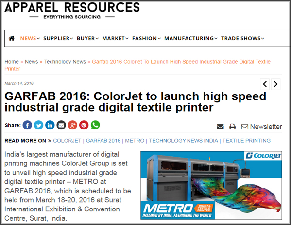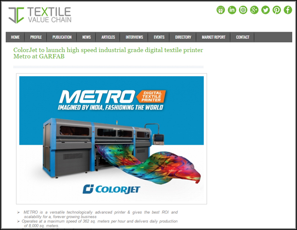 ColorJet to Launch High Speed Industrial Grade Digital Textile Printer Metro at GARFAB Surat, 2016