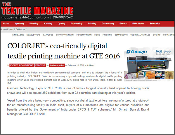 COLORJET'S eco-friendly digital textile printing machine at GTE 2016