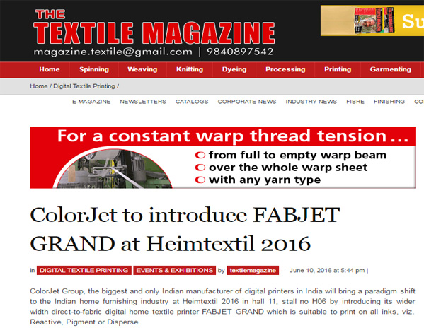 ColorJet Group, the biggest and only Indian manufacturer of digital printers in India will bring a paradigm shift to the Indian home furnishing industry at Heimtextil 2016 in hall 11, stall no H06 by introducing its wider width direct-to-fabric digital home textile printer FABJET GRAND which is suitable to print on all inks, viz. Reactive, Pigment or Disperse.